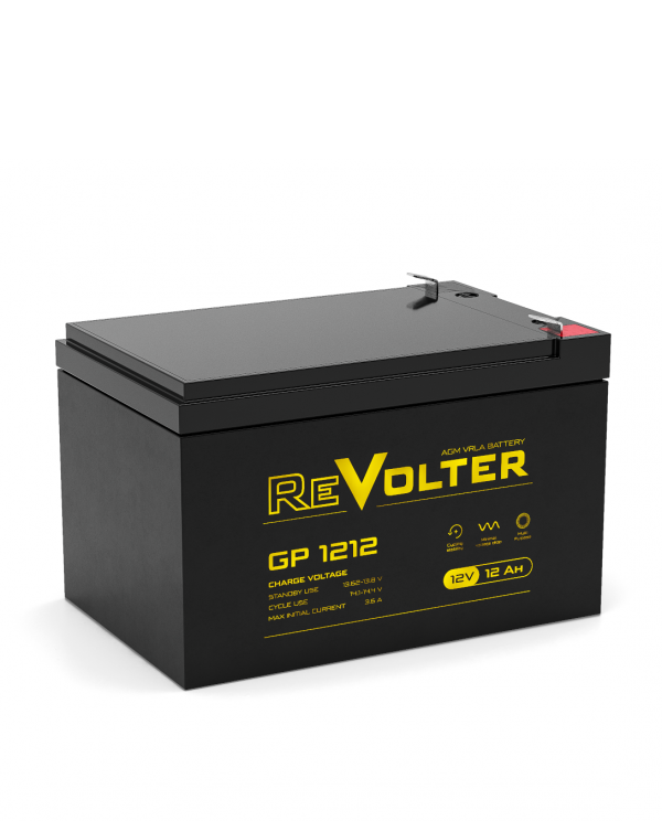 Свинцово-кислотный AGM аккумулятор Revolter GP 1212 производится напряжением 12В и ёмкостью 14 Ач по технологии VRLA. Корпус выполнен из ударопрочного пластика и надежно герметизирован, обслуживание (долив воды) на протяжении всего срока эксплуатации не требуется. Внутри него расположены микропористые стекловолоконные сепараторы, удерживающие электролит в неподвижном состоянии. Односторонний клапан избыточного давления находится на крышке и сбрасывает избыточное давление газа в атмосферу. Revolter GP 1212 подходит для использования как в буферном, так и в циклическом режиме: срок эксплуатации составляет 5 лет или 1200 циклов при DOD = 30%. Разрядные характеристики выше на 8% на коротких и длинный интервалах. В сравнении с конкурентами аккумулятор Revolter GP 1212 обладает большей емкостью при тех же габаритах.