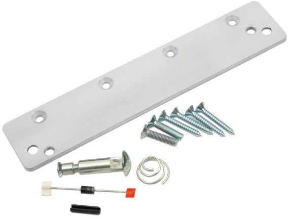 - Комплект 350Р - пластина для крепления якоря с внутренней стороны двери без сверления сквозного отверстия и возможностью регулировки положения на двери.