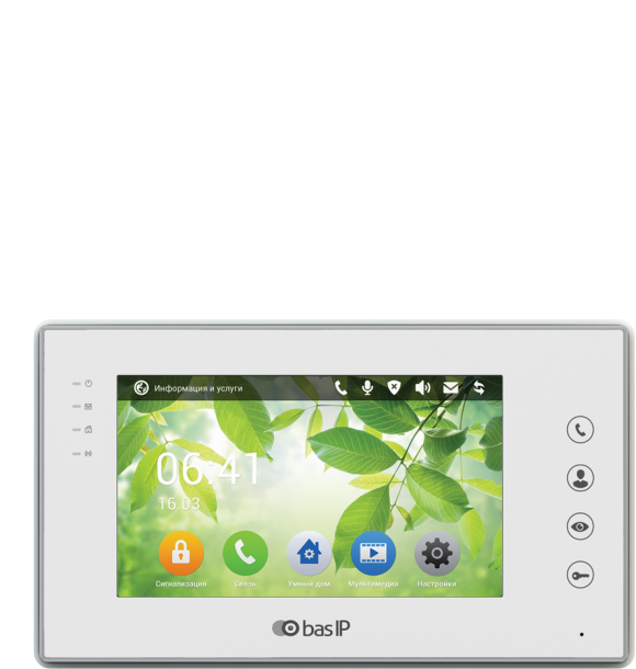 IP домофон в классическом корпусе с возможностью подключения системы умного дома (контроль света, кондиционера управление шторами, контроль датчиков и клапанов). Имеет возможность подключения проводных датчиков для сигнализации. Сохраняет в памяти до 100 фотографий посетителей. Работает в режиме фоторамки, имеет слот для SD карты. Не имеет камеры для видеоинтеркома.