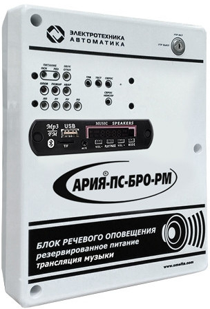 АРИЯ-ПС-БРО-РМ - блок речевого оповещения на 1 зону выходной мощностью 40 Вт, подключением громкоговорителей сопротивлением 8 Ом и предназначенного для формирования и трансляции сигналов ГО и ЧС, фоновой музыки, а также самостоятельно записанных 3-ёх речевых сообщений.
