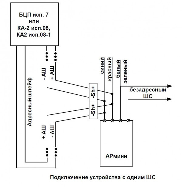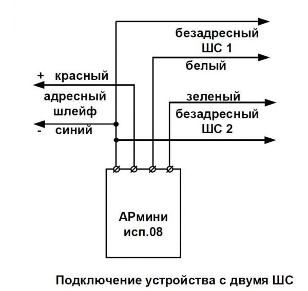 АРмини исп.08 - расширитель адресный обеспечивает подключение 2-ух безадресных шлейфов с извещателями, имеющими выход типа «сухой контакт», или аналогичными и подключается в 2-ух проводный адресный шлейф: БЦП исп.7, 7-1, 7У, 7-1У, СКАУ-01 исп.1_2 или КА2 исп.08, 08-1.