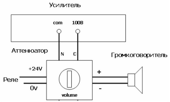При поступлении 24 В на встроенное реле, происходит принудительное отключение регулировки громкости и звуковой сигнал поступает на громкоговоритель в полную мощность, что соответствует нормам пожарной безопасности.