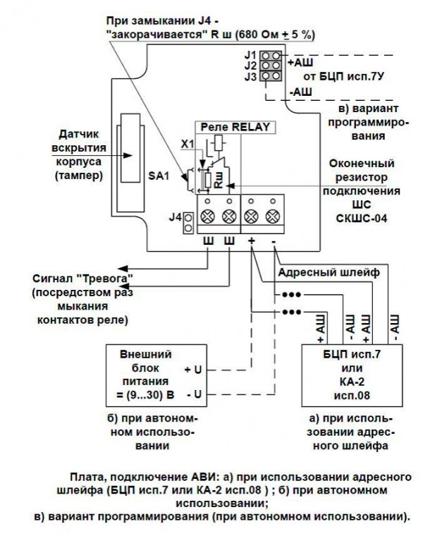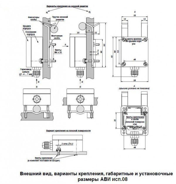 АВИ исп.08 - извещатель охранный поверхностный вибрационный адресный предназначен для обнаружения попыток разрушения защищаемых металлических конструкций, в том числе перепиливания прутка диаметром (8 - 25 мм), сверления, многократных ударов, а также перемещения самого извещателя или его вскрытии и подключается в 2-ух проводный адресный шлейф: БЦП исп.7, 7-1, 7У, 7-1У, СКАУ-01 исп.1_2 или КА2 исп.08, 08-1.