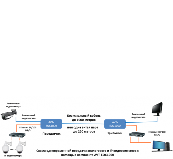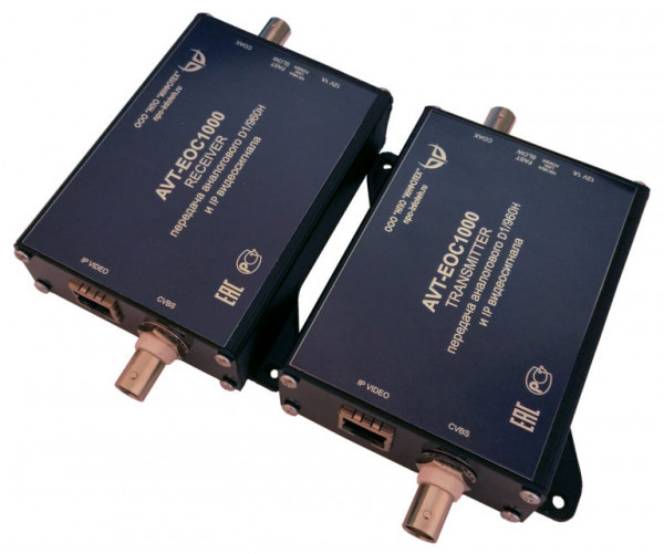 AVT-EOC1000 - активный комплект для одновременной (совместной) передачи аналоговых (CVBS) и IP-видеосигналов по одному коаксиальному кабелю или одной витой паре в кабеле UTP (два провода) на расстояние до 1000 метров.