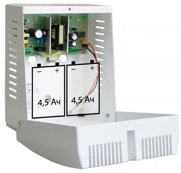 Резервированный источник питания; U-вых.20…27.8 В, I-вых.1 А(ном.), I-вых.1.5 А (max), U-вх.175…245 В, под два АКБ 12 В 4.5 А·ч; диагностический релейный выход "ПЕРЕХОД НА РЕЗЕРВ", световая индикация режимов работы, защита от короткого замыкания, защита аккумулятора от глубокого разряда; IP20, t-раб.-10…+40°С, 170х210х136 мм. Металлопластиковый корпус.