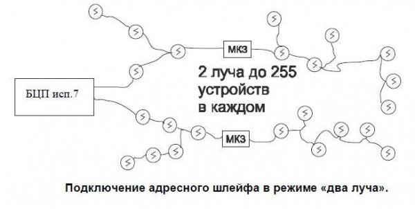 - Контроль до 255 устройств на встроенном 2-ух проводном адресном кольцевом шлейфе, до 510 (2х255) - на 2 радиальных лучах.