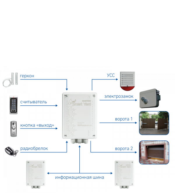 - Управление тремя точками входа: одной калиткой и двумя воротами.
