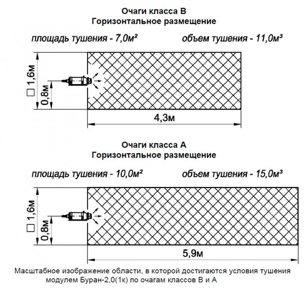 Буран-2(1К) - модуль импульсного порошкового пожаротушения в специальном исполнении (прямоточного распыла), с температурным диапазоном эксплуатации (от -50 до +95°С), с встроенным устройством электрозапуска (ЭС-0,7-4 - другие под заказ), предназначен для автоматического подавления очагов пожара классов А (твердых веществ), В (жидких веществ), С (газообразных веществ) и Е (электрооборудования, находящегося под напряжением без учёта параметра пробивного напряжения огнетушащего порошка).