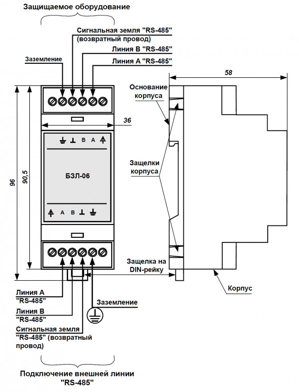 Используется для защиты оборудования, подключенного к линии связи интерфейса «RS-485» (сетевые контроллеры шлейфов сигнализации СКШС и т.п.). БЗЛ-06 содержит – один канал защиты линии связи «RS-485»