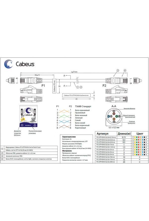 Cabeus PC-UTP-RJ45-Cat.5e-10m - патч-корд (коммутационный шнур U/UTP, оболочкой - PVC, категории - 5е, с разъемами: RJ-45 - 2шт.) серого цвета, неэкранированный и длинной - 10м для подключения оборудования к кабельной системе, а также для коммутации портов в кроссовых узлах между портами активного оборудования и патч-панелями.