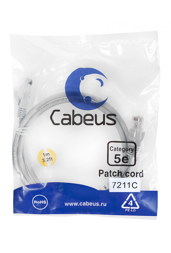 Cabeus PC-UTP-RJ45-Cat.5e-1m - патч-корд (коммутационный шнур U/UTP, оболочкой - PVC, категории - 5е, с разъемами: RJ-45 - 2шт.) серого цвета, неэкранированный и длинной - 1м для подключения оборудования к кабельной системе, а также для коммутации портов в кроссовых узлах между портами активного оборудования и патч-панелями.