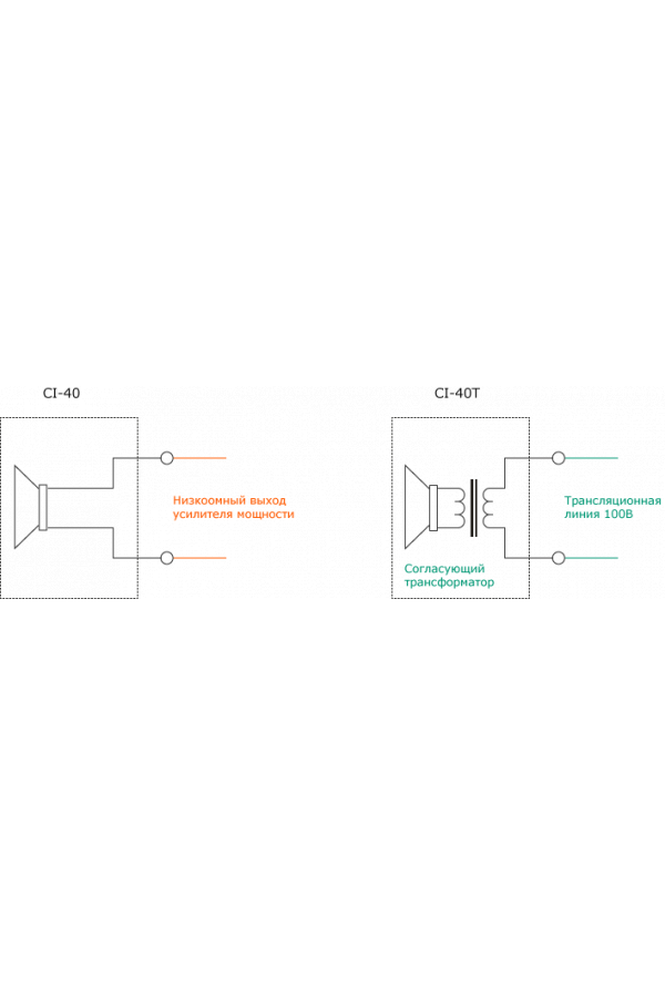 CI-40T(W) - речевой (белого цвета) настенный широкополосный накладной оповещатель с встроенным трансформатором, мощностью 20 Вт и возможностью подключения к высокоомному выходу сопротивлением 500 Ом и питанием 100В предназначен для воспроизведения сигналов ГО и ЧС, речевых сообщений и фоновой музыки в системах пожарного оповещения.
