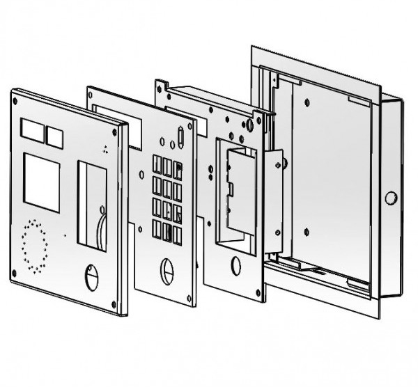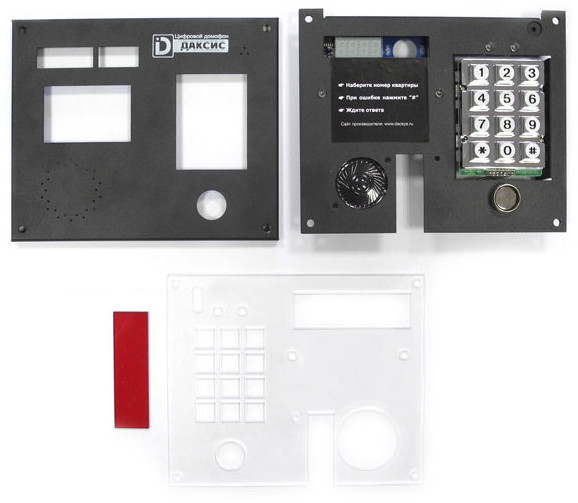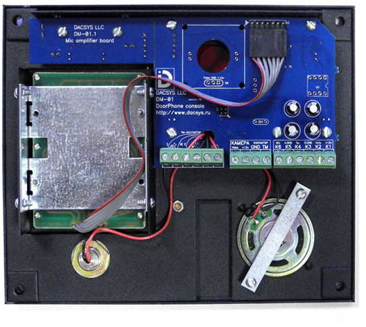 В панели установлен врезной контактор для ключей Touch Memory с возобновляемой защитой (внешнего) контроллера от подачи высокого напряжения, также предусмотрено место для установки бескорпусной видеокамеры с размером платы 32х32мм и объективом с диаметром до 16мм (камера в комплект поставки не входит).