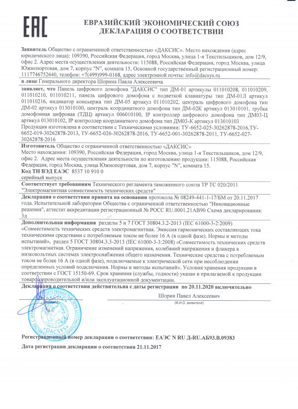 Электронно-сигнальная совместимость проверена с блоками управления домофонов CD1803, CD2000, CD2255, EC-2502.
