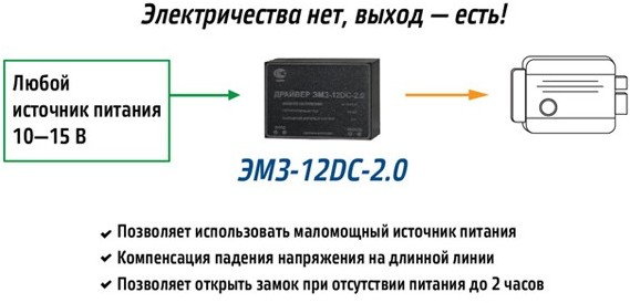 Драйвер ЭМЗ-12DC-2.0 - предназначен для совместной работы с электромеханическим замком и позволяет использовать маломощный источник питания напряжением 10-15 В с допустимым током нагрузки не ниже 50 мА для открытия электромеханического замка, а так же позволяет открыть его однократно при отсутствии питания до 2 часов.