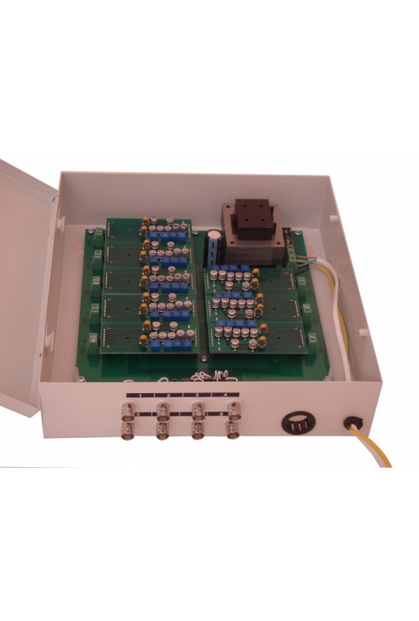 Количество видеовходов-8, количество видеовыходов-8, габариты 240х240х60 мм, выходные разъемы BNC расположены на нижней стенке корпуса.