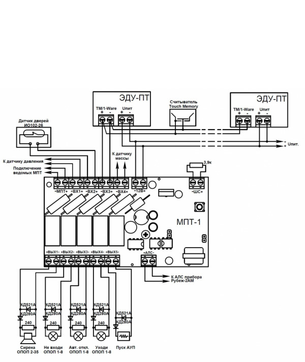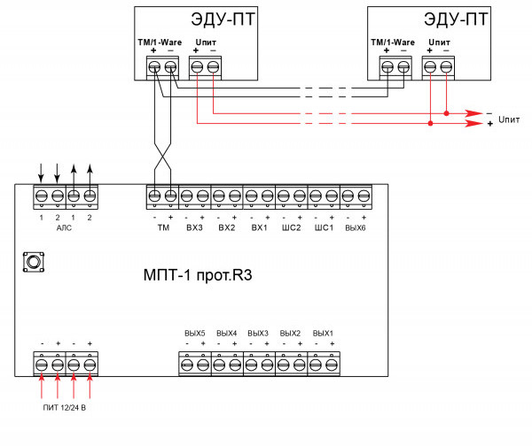 К одному модулю МПТ-1 в линию ТМ/1-Ware (вход 3) можно подключить до 4-х элементов ЭДУ-ПТ.