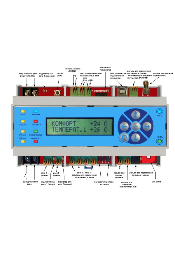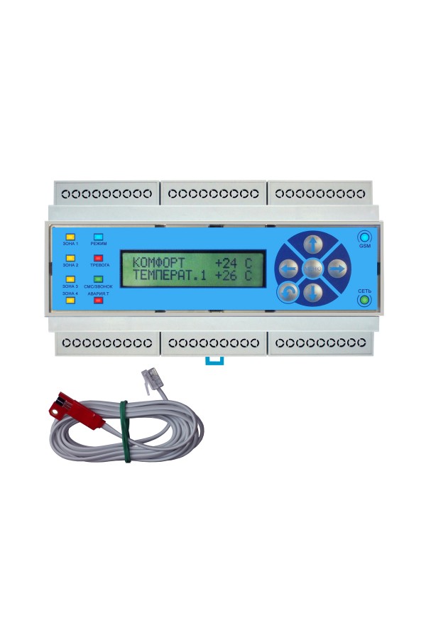 Четыре универсальные зоны, проводные и беспроводные датчики, контроль температуры от беспроводных термометров, терморегулятор, шесть управляемых реле, четыре из них 220 В на внешнем блоке , контроллер ТМ, управление с брелока , приложение под ANDROID