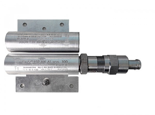 Ех ИО102 МК Al исп.300 с магнитом М-200 КМ15 - извещатель цилиндрической формы охранный взрывозащищённый (1ExdIICT6…Т5Gb) точечный магнитоконтактный с переключаемыми типа (НО и НЗ) контактами исполнительного блока (геркона), в корпусе из алюминиевого сплава (Д16Т), с кабельным вводом для присоединяемого кабеля (диаметр: 6 - 12мм) для прокладки в металлорукаве (КМ15 - диаметр 15мм), в комплекте с магнитом (М200) и предназначенным для контроля положения частей конструкций и механизмов, других конструктивных магнитопроводящих (металлических) и магнитонепроводящих (алюминиевых, деревянных и т.д.) элементов зданий и сооружений на открывание и смещение с выдачей в шлейф приёмно-контрольного прибора извещения о тревоге путем переключения контактов геркона.