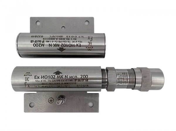 Ех ИО102 МК N исп.300 с магнитом М-100 К - извещатель цилиндрической формы охранный взрывозащищённый (1ExdIICT6…Т5Gb или РBExdIMb) точечный магнитоконтактный с переключаемыми типа (НО и НЗ) контактами исполнительного блока (геркона), в корпусе из нержавеющей стали (12Х18Н10Т), с кабельным вводом для присоединяемого кабеля (диаметр: 6 - 12мм) для открытой прокладки (К), в комплекте с магнитом (М100) и предназначенным для контроля положения частей конструкций и механизмов, других конструктивных магнитопроводящих (металлических) и магнитонепроводящих (алюминиевых, деревянных и т.д.) элементов зданий и сооружений на открывание и смещение с выдачей в шлейф приёмно-контрольного прибора извещения о тревоге путем переключения контактов геркона.