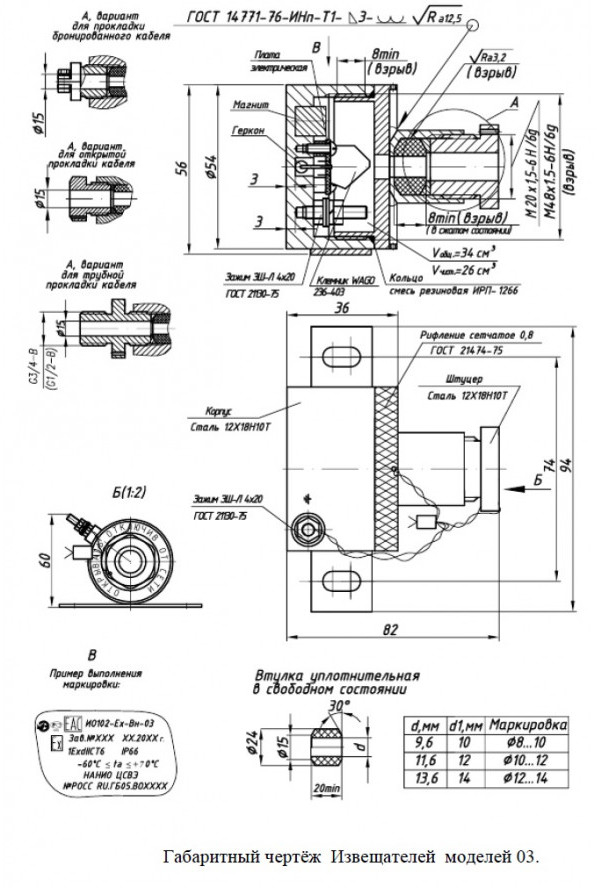 Ех ИО102-1В-03-Б - извещатель моноблок (геркон и магнит в одном корпусе) охранный взрывозащищённый (1ExdIICT6) точечный магнитоконтактный с переключаемыми типа (НО и НЗ) контактами геркона, в корпусе из коррозионностойкой стали (12X18H10T), с кабельным вводом для присоединяемого кабеля (диаметр: 8 - 14мм) для прокладки бронированным кабелем (Б) и предназначенным для контроля положения частей конструкций и механизмов, других конструктивных магнитопроводящих (металлических) и магнитонепроводящих (алюминиевых, деревянных и т.д.) элементов зданий и сооружений на открывание и смещение с выдачей в шлейф приёмно-контрольного прибора извещения о тревоге путем переключения контактов геркона.