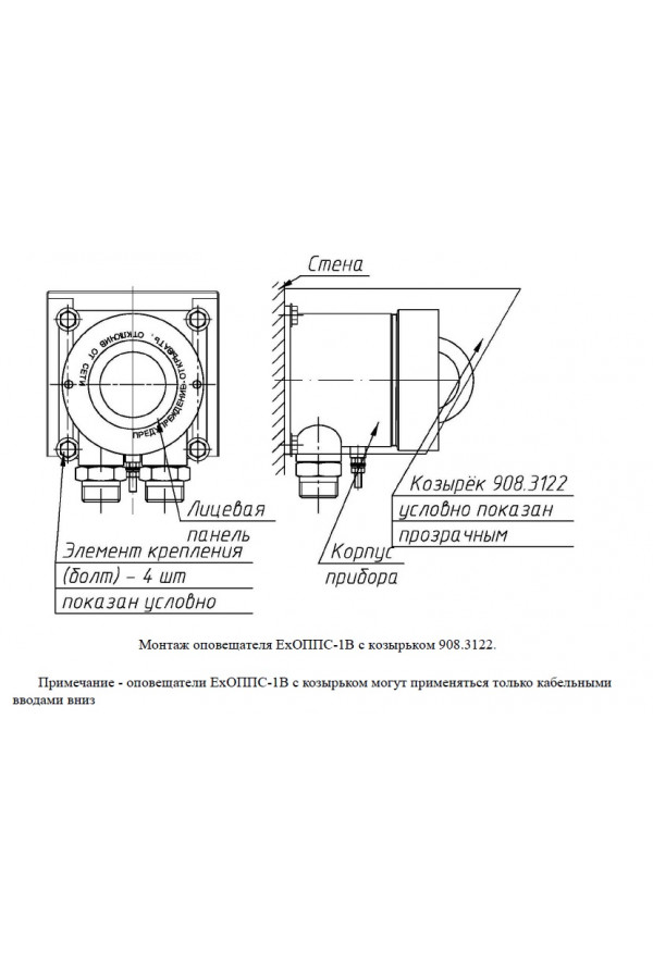 ExОППС-1В-Р-Н-Б - оповещатель специальный пожарный взрывозащищенный (1ExdbIICТ6Gb), световой (режим свечения - непрерывный и прерывистый, управляемые с помощью DIP- переключателей - 4 шт. и включением через клеммную колодку по схеме: при подаче напряжения или замыканием внешнего "сухого контакта"), напряжением питания (10 - 60 В), степенью защиты (IP67), с 2-мя кабельными вводами для прокладки бронированного кабеля диаметром (8 - 14 мм) и уплотнительными кольцами (ИРП-1266) из термостойкой резины (всё в комплектации), для установки на улице - козырька (по необходимости приобретается отдельно) предназначен для подачи светового сигнала в системах пожарной и охранной сигнализации при совместной работе с любыми приемно-контрольными устройствами и применяется на предприятиях химической, нефтегазодобывающей, нефтегазоперерабатывающей отраслей и взрывоопасных зонах (1 и 2 классов) других производств.
