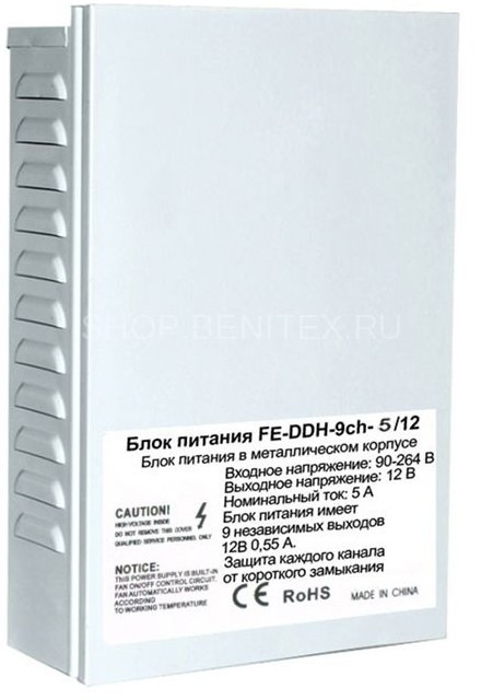 FE-DDH-9ch-5/12 Блок питания в металлическом корпусе . Входное напряжение 90-264V, Выходное 12V, Номинальный ток 5A. Блок питания имеет 9 независимых выходов 12V 0,55A, защика каждого канала от короткого замыкания.