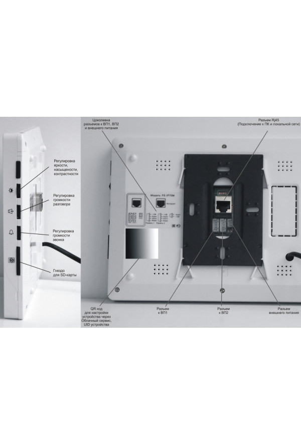 FE-IP70M - цветной IP домофон 7 дюймовый без трубки (Hands Free) обеспечивает функции наблюдения за посетителями, переговоров и открытия замка, со встроенным блоком питания, поддержка карт памяти до 32 Гб.