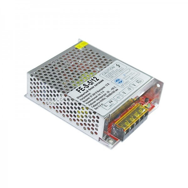 FE-S-5/12 Открытый Блок питания. Входное напряжение 87-264V, Выходное 12V, Номинальный ток 5A, Рабочай температура -20 +60С, Габариты H=38/W=98/L=160, Вес 0,4кг.