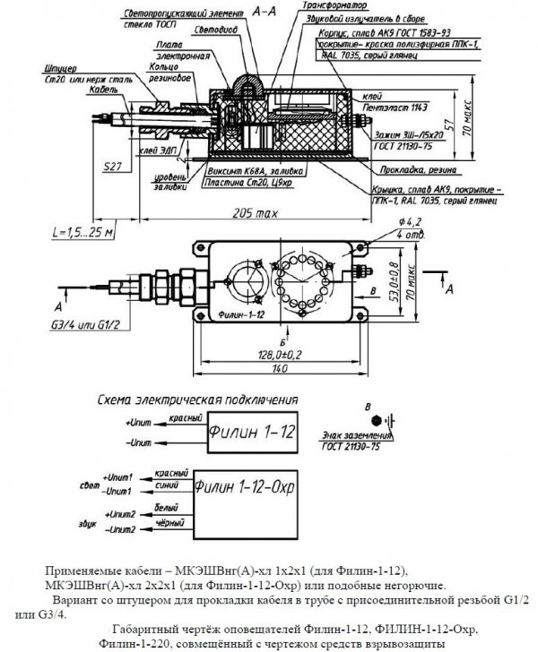ФИЛИН 1-12 - оповещатель пожарный взрывозащищенный (1ExmbdbIICT6GbX), светозвуковой (прерывистый - свет, 105 дБ - непрерывный звук по схеме: при подаче напряжения), степенью защиты (IP66/67), напряжением питания (10,8 - 28 В), с присоединённым кабелем (муфта с резьбой G1/2" на торце корпуса) длиной (1,5м; другой размер - до 25 под заказ) предназначен для подачи светового и звукового сигналов в системах пожарной и охранной сигнализации при совместной работе с любыми приемно-контрольными устройствами и применяется на предприятиях химической, нефтегазодобывающей, нефтегазоперерабатывающей отраслей и взрывоопасных зонах (1 и 2 классов) других производств.