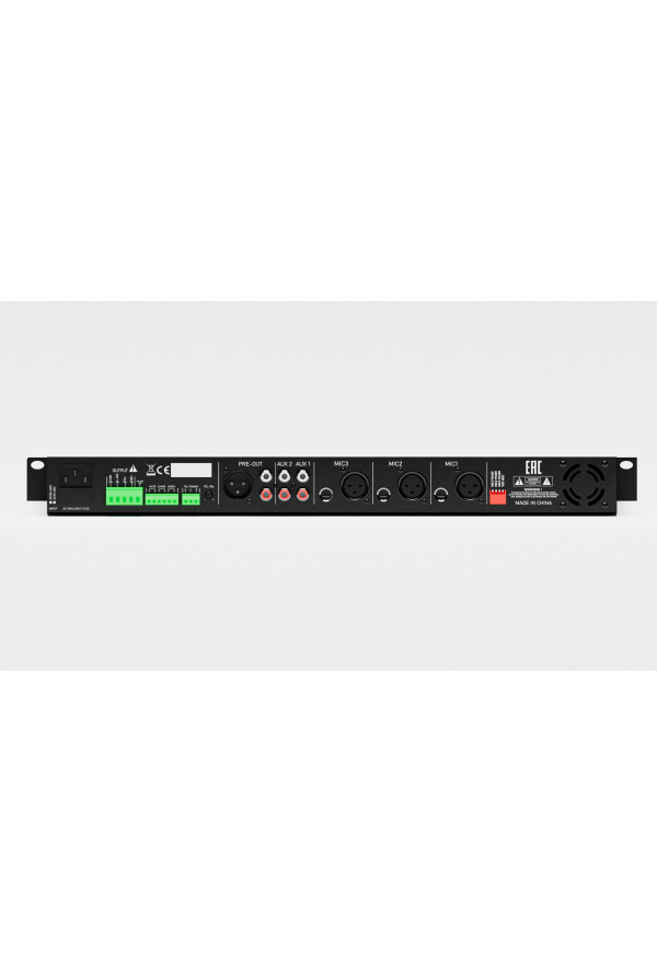 Один канал, мощность на выходе составляет 60 Вт. Возможно подключение как трансляционных (напряжение в линии 70/100В), так и низкоомных (импеданс линии 4-16 Ом) акустических систем. Важно отметить, что одновременно можно применять акустику только одного типа. Диапазон воспроизводимых частот 80 Гц - 20 кГц.