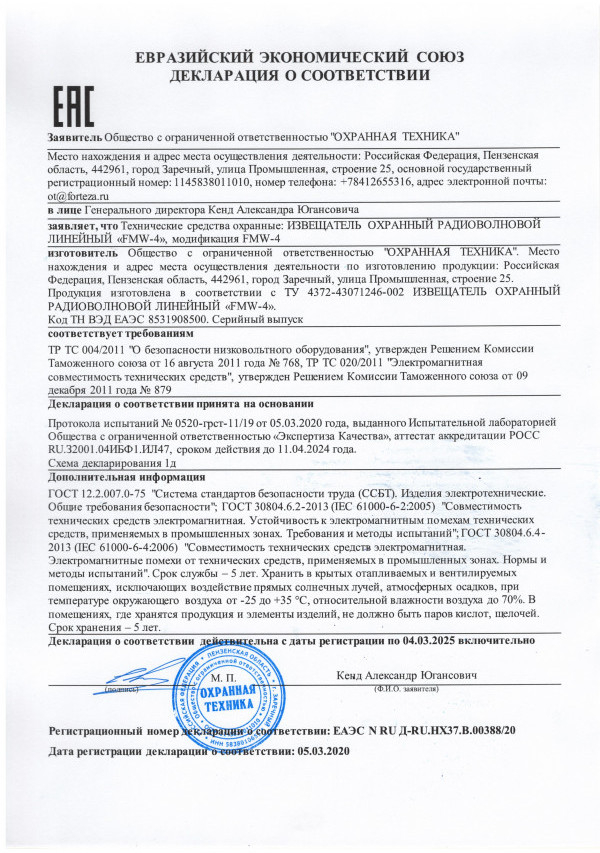 FMW-4 - извещатель охранный линейный радиоволновый 2-х позиционный в составе блоков: передатчика и приёмника предназначен для обнаружения проникновения через периметр (зону открытого пространства) охраняемого объекта и формирование извещения о тревоге путем размыкания (1 НЗ) выходных контактов оптоэлектронного реле.