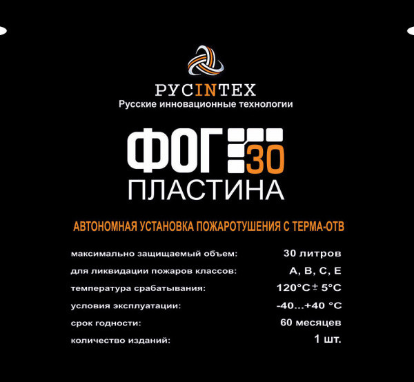 ФОГ 30 пластина - автономная установка пожаротушения с Терма ОТВ предназначается для подавления возгораний в объемах до 30 литров/ 0,03 м куб. таких как: распределительные щиты, электрошкафы и панели управления, сейфы, хранилища ценностей, блочно-модульные топливохранилища и прочие объекты со степенью защиты IP-20 и выше (в том числе на стационарных объектах, подвижном составе и.т.п., в жилых помещениях и на социальных объектах с постоянным или временным пребыванием людей).