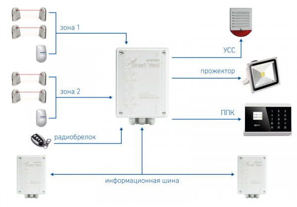 В случае определения попытки проникновения контроллер формирует соответствующий сигнал типа «сухой контакт» для передачи на ППК, на информационную шину для оповещения других контроллеров системы Smart Yard, а также активирует свето-сигнальное устройство и прожектор.