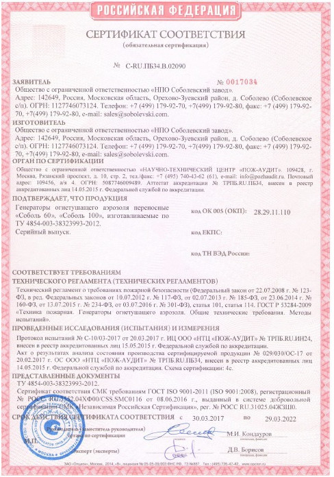 Соболь-100 - переносной генератор огнетушащего аэрозоля является средством объемного пожаротушения и предназначен для локализации и тушения пожаров легковоспламеняющихся и горючих жидких (бензин и другие нефтепродукты, органические растворители и т.п.) и твердых материалов (древесина, изоляционные материалы, пластмассы и др.), а также электрооборудования (силовые и высоковольтные установки, бытовая и промышленная электроника и т.п.), в том числе находящегося под напряжением до 40 кВ.