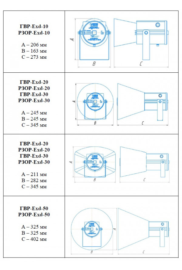 ГВР-Exd-10-Прометей - оповещатель рупорный пожарный взрывозащищенный (1ExdIICТ6X), речевой мощностью - 10 Вт, степенью защиты (IP66), с 2-мя отверстиями с резьбой (М20х1,5) для кабельных вводов (тип - указывает заказчик и приобретаются отдельно) предназначен для трансляции речевых сообщений и иной звуковой информации с внешних источников сигнала в системах пожарной и охранной сигнализации при совместной работе с трансляционными усилителями всех отечественных и зарубежных производителей и применяется на предприятиях химической, нефтегазодобывающей, нефтегазоперерабатывающей отраслей и взрывоопасных зонах (1 и ниже классов) других производств.