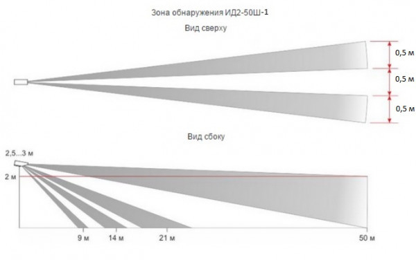 ИД2-50Ш-1 исп.5 - извещатель охранный инфракрасный оптико-электронный пассивный (повышенной защищённости), с дополнительным подогревом предназначен для обнаружения: проникновения через периметр охраняемого объекта, а также в охраняемое закрытое пространство и формирование извещения о тревогах (2-ух участков) путем размыкания (НЗ) выходных 2-ух контактов оптоэлектронных реле.