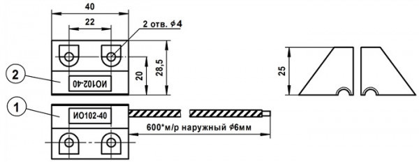 ИО 102-40 Б3П (3) - извещатель накладной охранный точечный магнитоконтактный с перекидными типа (НО и НЗ) контактами, в корпусе из пластика и цвета (белый, серый, чёрный, коричневый, терракотовый - указать в заказе), с проводным выводом в двойной изоляции и длиной (0,6м; другая - под заказ) в металлическом гофрорукаве предназначен для блокировки гаражных ворот, ангаров, железнодорожных контейнеров, телефонных шкафов и других конструктивных магнитопроводящих (металлических) и магнитонепроводящих (алюминиевых, деревянных и т.д.) элементов зданий и сооружений на открывание и смещение с выдачей в шлейф приёмно-контрольного прибора извещения о тревоге путем переключения контактов геркона.