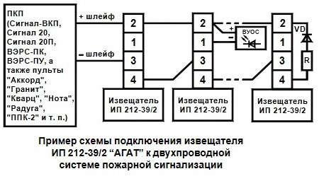 ИП 212-39/2 (АГАТ) - точечный дымовой 2-ух проводный оптикоэлектронный пожарный извещатель, токопотребляющий, восстанавливаемый (многократного действия), обычного исполнения предназначен для обнаружения загораний, сопровождающихся появлением дыма, и передачи на ППКОП сигнала тревожного сообщения (Пожар) за счёт дискретного уменьшения внутреннего сопротивления извещателя.