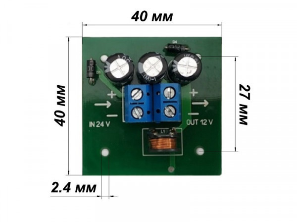 Импульсный преобразователь напряжения; U-вх.24 В, I-потр.30 мА, P-потр.0.8 Вт, U-вых.12 В, I-вых.180 мА; t-раб.-30...+40°С, 40х40х10 мм. Без корпуса.