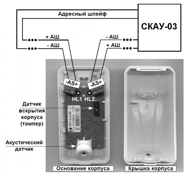 Извещатель имеет два встроенных светодиода, для контроля за состоянием извещателя, а так же тампер вскрытия корпуса, для защиты извещателя от вскрытия.