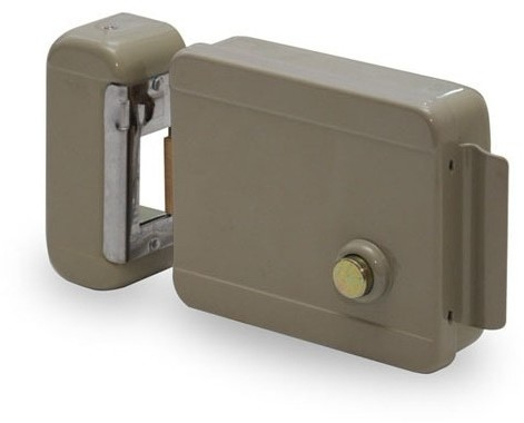 Замок электромеханический, накладной, без блокировки открывания, универсальный - под любой тип двери, DC 12В. Откр. изнутри - кнопка. Цвет - матовый серый.