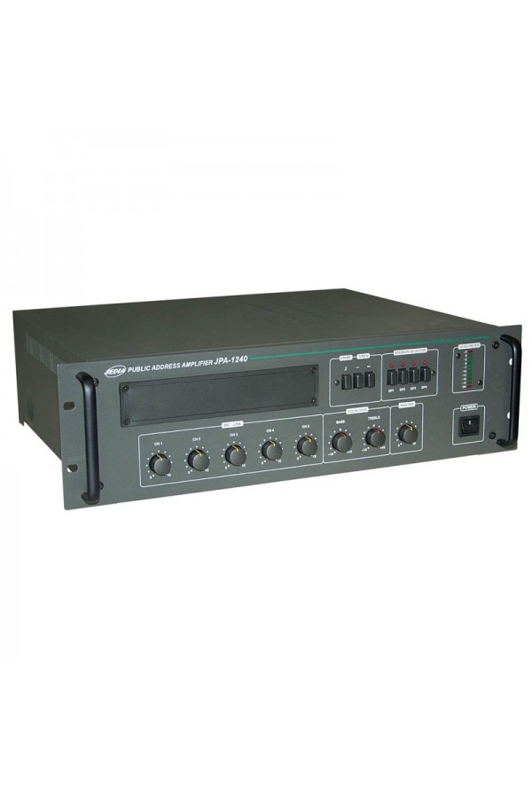 Микшер-усилитель 240 Вт100В, 5 микр.лин. + телеф. входов, блок сирен, селектор зон, функция приоритетов, аварийный режим включения, возможность установки CD, тюнера, касс. деки, цифр. блока сообщений, питание 24220В