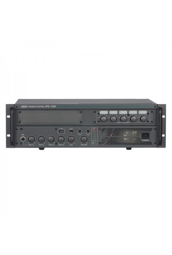 Микшер-усилитель 120 Вт100В, 5 микр.лин. входов, блок сирен, селектор зон с аттенюаторами, функция приоритетов, аварийный режим включения, возможность установки CD, тюнера, касс. деки, цифр. блока сообщений, питание 24220В, возможность установки в 19 рэк.