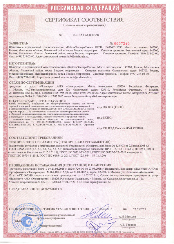 Кабель КПСнг(А)-FRLSLTx 1х2х0,35 (КЭС)– огнестойкий негорючий кабель, выделяющий малое количество токсичных веществ и дыма при горении.