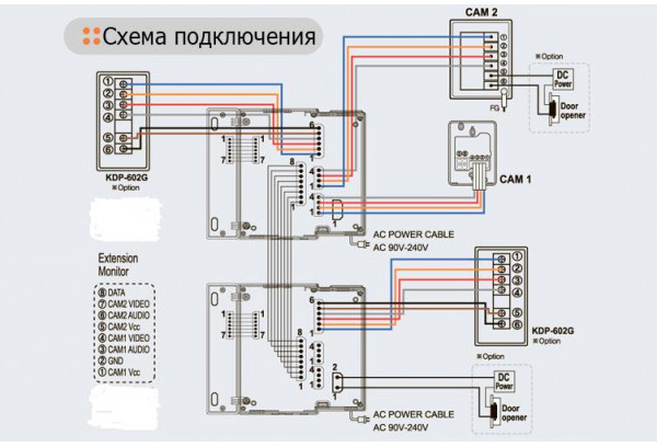 - возможность подключения 2-х вызывных панелей или 2-х камер (вместо вызывных панелей), 2-х аудиотрубок KDP-602G;