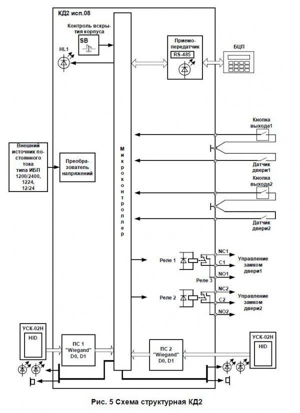 Контроллер предназначен для приема управляющих сигналов от: УСК (устройств считывания кода) с выходным интерфейсом (Wiegand 26, 58; Touch Memory) и передачи информации в БЦП Р-08 исп.7У, 8 для дальнейшего управления исполнительными устройствами (электромеханический замок, импульсная защелка, электромагнитный замок, турникет, шлагбаум и пр.).