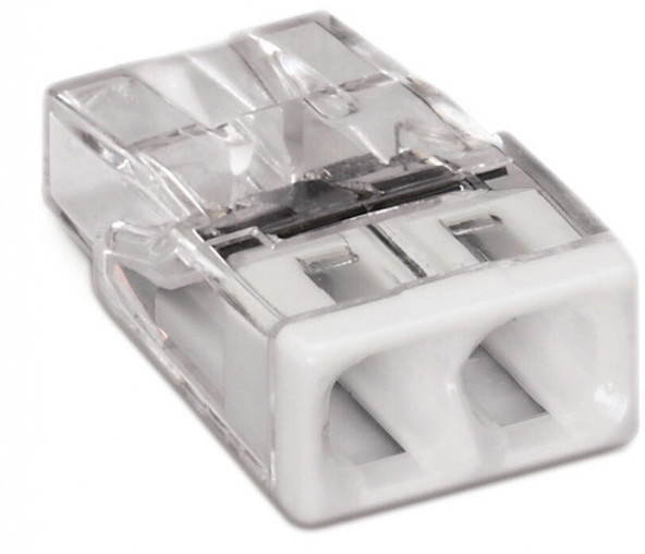 Клеммник WAGO 2273-242 - клеммный соединитель с токопроводящей пастой Alu-Plus 2-х проводный вставного типа (с пружинным зажимом) прозрачный+белая крышка серии COMPACT для сращивания всех однопроволочных медных, алюминиевых (или вместе: медь и алюминий) проводников максимальным сечением жилы (до 2,5 мм2).