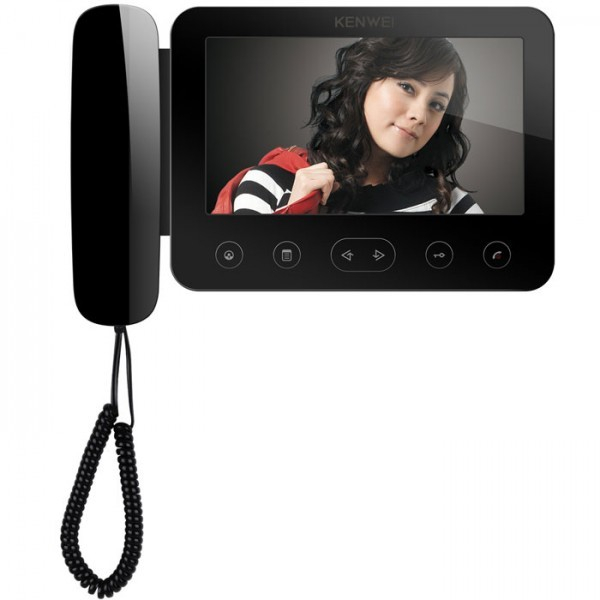 Монитор цветного видеодомофона с трубкой, LCD TFT 7 , 16 9, PAL/NTSC, встроенная память 100 цветных кадров, сенсорное управление. 12 полифонических мелодий вызова. Макс. подключение 2 вызывные панели (с блоком KW-516F подключение до 4 вызывных панелей) + 2 видеокамеры + 3 дополнительных монитора KENWEI (поддержка адресных звонков между мониторами), с возможностью дополнительного подключения к каждому дополнительному монитору дополнительных видеокамер, подключение дверного звонка, управление внешними устройствами типа автоматики для ворот (отдельная кнопка), функция не беспокоить , поддержка переадресации вызовов на любой телефон с помощью KW-401G с возможностью дистанционного управления замком, настройка времени включения экрана от бесконечности до нескольких секунд, питание монитора 220В (встроенный блок питания) или от 12V, возможность питания видеокамер от монитора (выход 13,5V,1,5А). Габариты 234x155x38мм