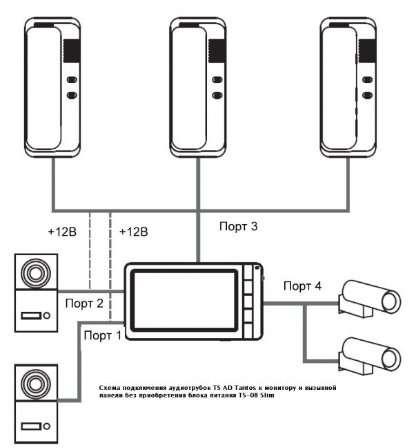 - Подключение 2-х вызывных панелей, 2+2 (вместо вызывных панелей) видеокамер или до 3-х аудиотрубок TS AD Tantos (вместо 3-х мониторов).
